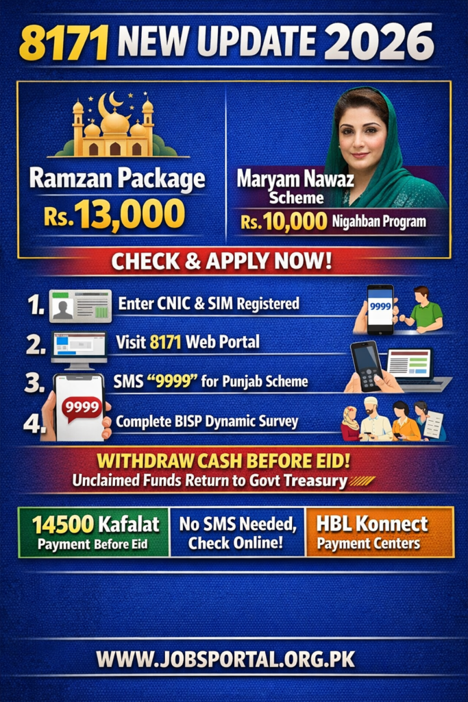 The Government of Pakistan has announced a major 8171 New Update 2026 regarding the Ramzan Relief Package Rs. 13,000 and Maryam Nawaz Rs. 10,000 Nigahban Program. Eligible families can now check their payment status online through the 8171 portal and apply using their CNIC and registered SIM before Eid.