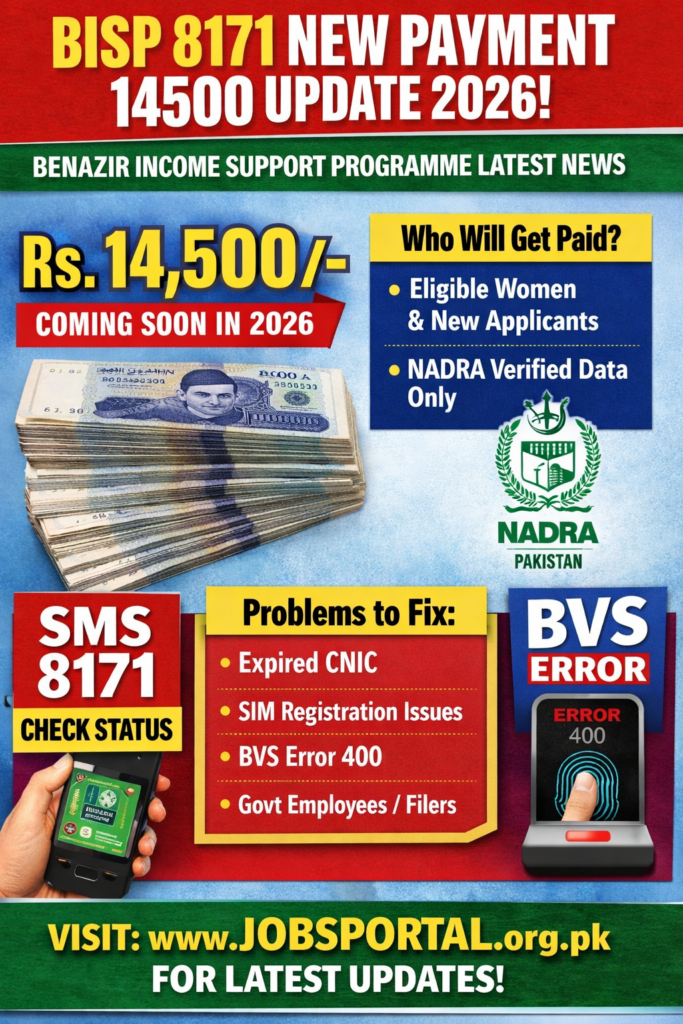 The BISP 8171 New Payment 14500 Update 2026 refers to the expected increase in the quarterly installment under the Benazir Income Support Programme. Eligible women under BISP may receive Rs 14,500 as part of the latest financial assistance cycle.