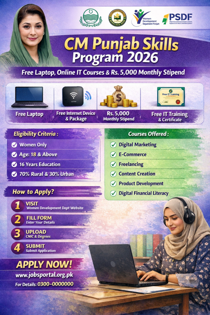 CM Punjab Skills Program 2026 is a six-month online training initiative launched by the Government of Punjab under the leadership of Maryam Nawaz Sharif and managed by the Women Development Department Punjab. The program provides free IT courses, a laptop, internet support, and Rs 5,000 monthly stipend to selected women across Punjab.
