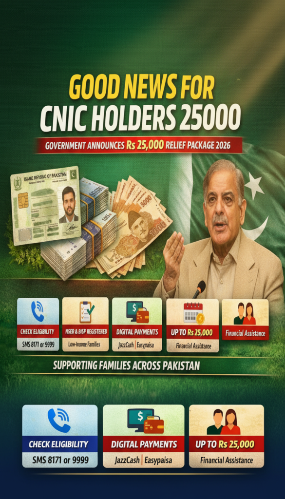 There is big relief news for thousands of families across Pakistan. The government has announced financial assistance of up to Rs 25,000 for eligible CNIC holders under special relief initiatives for 2026. This support is aimed at helping low-income households manage rising expenses, especially during the holy month of Ramzan and other economic challenges.