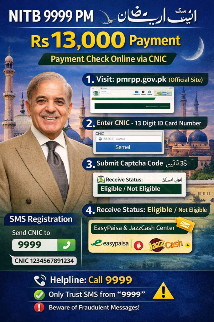 If you want to check whether your Rs 13,000 payment under the NITB 9999 PM Ramzan Package Registration 2026 has been approved, follow the official CNIC verification method below.