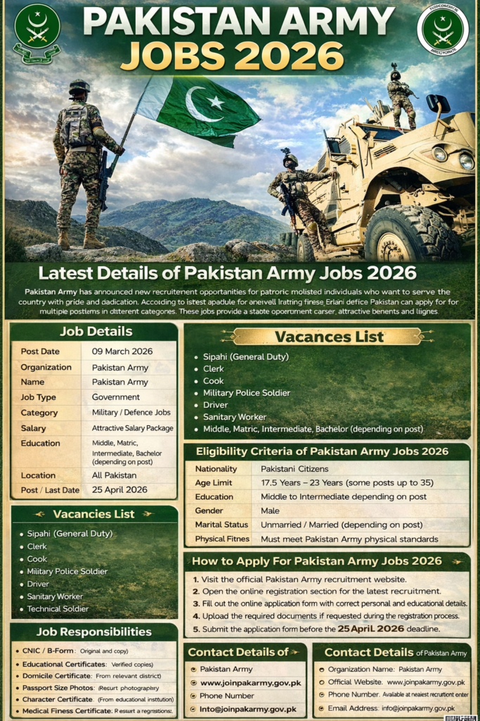 Pakistan Army Jobs 2026 Online Apply opportunities have been announced for motivated and patriotic individuals who wish to serve the country with pride and dedication. The Pakistan Army is offering multiple vacancies in different categories including Sipahi, Clerk, Driver, Cook, Military Police, and other support staff positions. These government jobs provide a stable career path, professional training, attractive salary packages, and various benefits for candidates who meet the required eligibility criteria. Applicants from across Pakistan can apply and become part of a respected defence institution that plays a vital role in national security and public service.