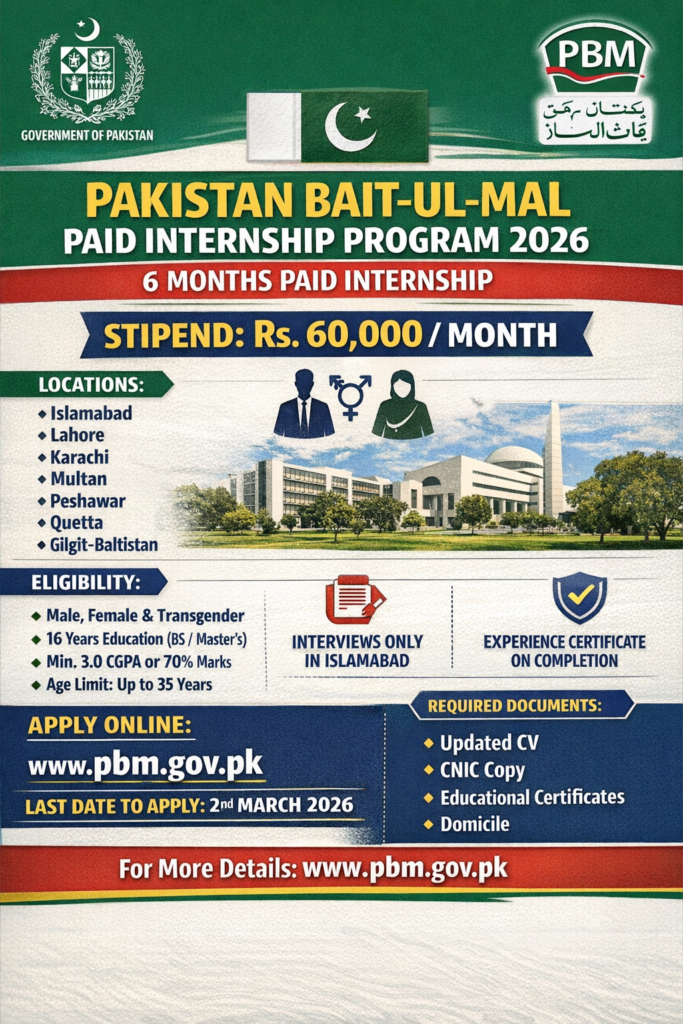 The Government of Pakistan has officially announced the Pakistan Bait ul Mal Internship 2026, offering a valuable paid internship opportunity for young graduates across the country. This program is designed to provide professional exposure, practical experience, and financial support to fresh graduates who want to build their careers in the public sector.